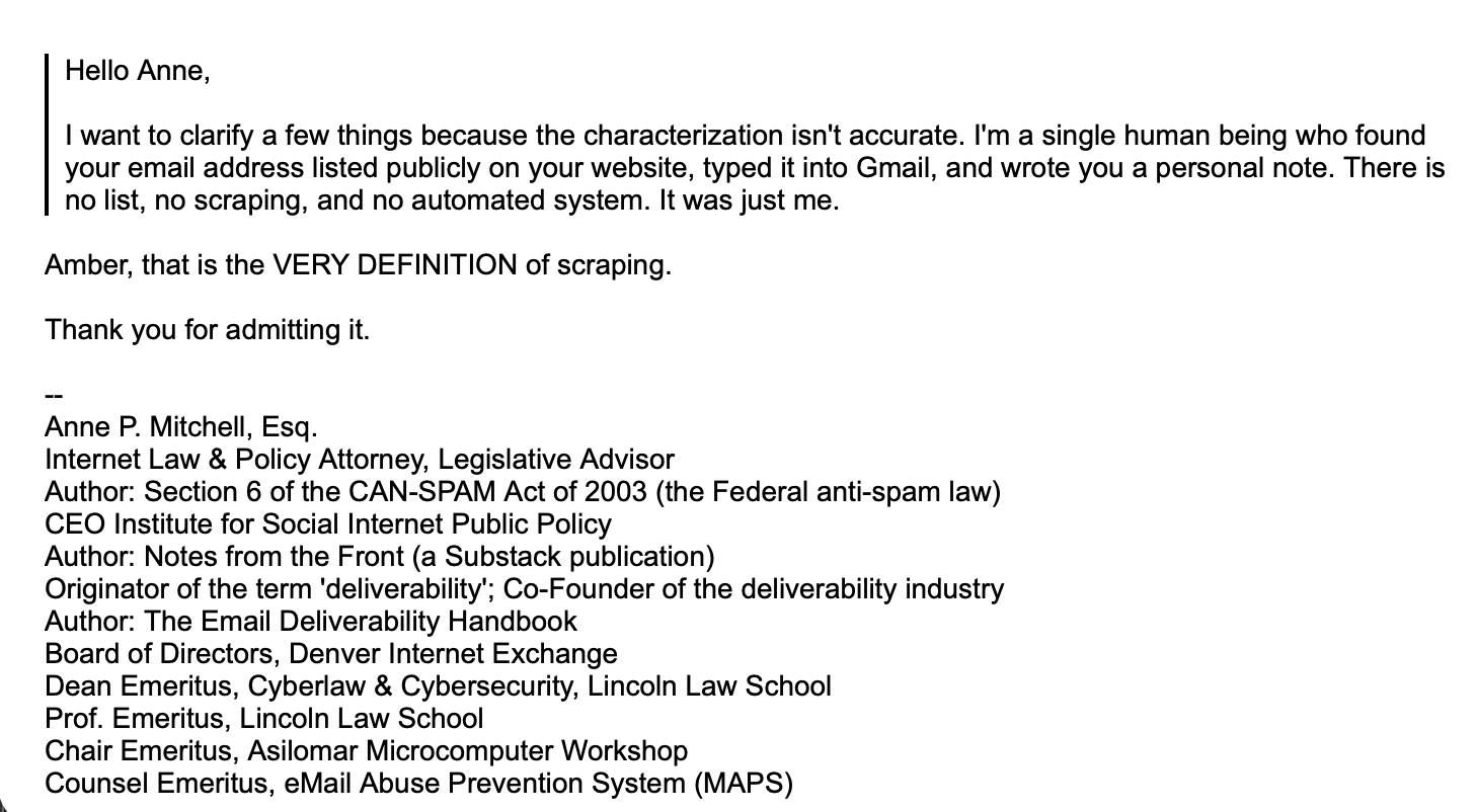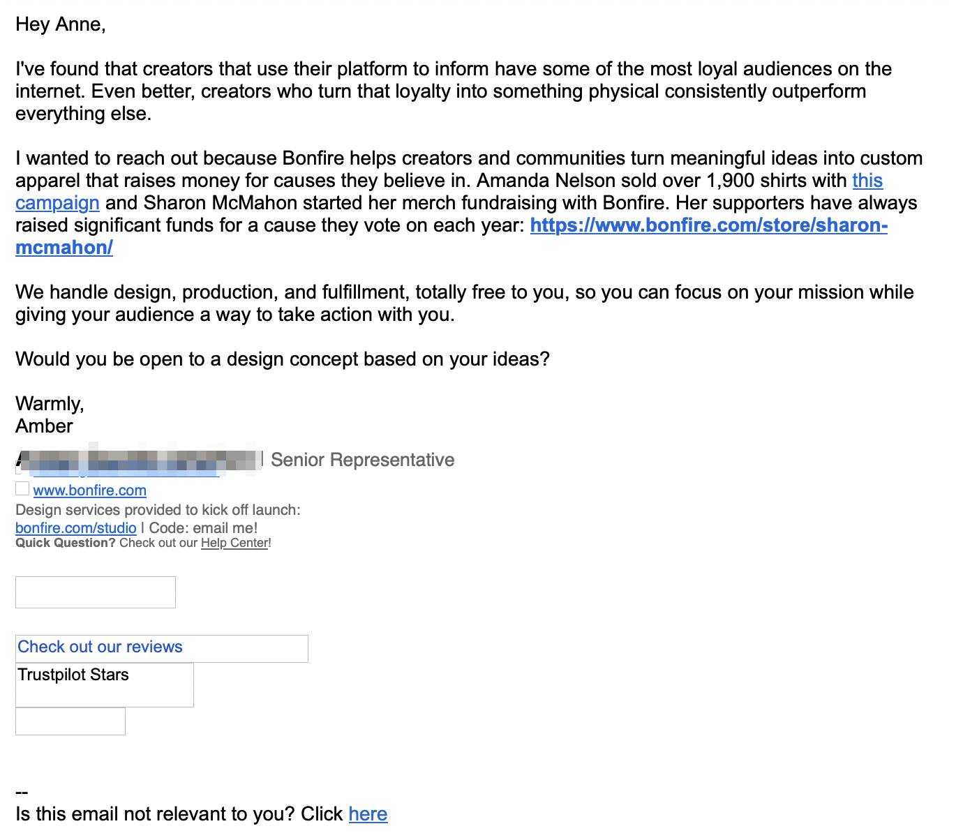 Amber at Bonfire seems to not grasp what scraping and spamming is. And Bonfire seems to not be giving adequate training to their spammers. This was her response to my spam complaint. (Spam from Bonfire in the second image)