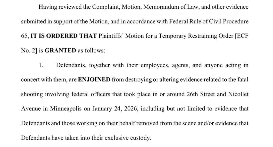 The Minnesota Department of Criminal Apprehension filed an emergency motion this evening asking the Federal District Court to restrain the administration from destroying evidence in the shooting of Alex Pretti. ICE may have tried to pull that stunt with the Renee Good shooting, but this time Minnesota was ready. The Court granted the TRO and will hold a hearing on Monday. The administration has until noon Monday to file any motion in opposition.