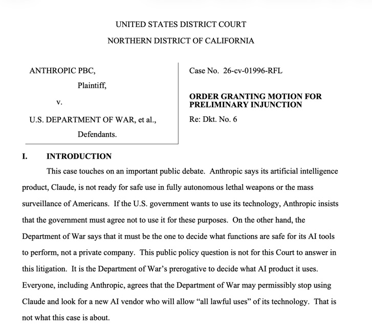 BREAKING!! WOOHOO! JUDGE ISSUES *PRELIMINARY INJUNCTION* HALTING THE GOVERNMENT’S BLOCKING THE USE OF ANTHROPIC!!