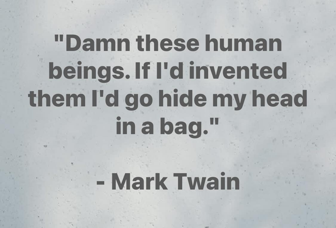 “Damn these human beings. If I’d invented them I’d go hide my head in a bag.”