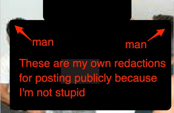 I have in my possession, and now transferred to our private dropbox, a 100-page pdf of Epstein file images. Many of the images are clearly photos of men with victims (so if you’re easily triggered, best to turn down this assignment – some of them are *very* graphic). The victims faces and private parts are redacted. But in *some* of the images, the *men’s* faces are *not* redacted (such as the screenshot below, in which *I* have redacted the men’s faces for public posting).