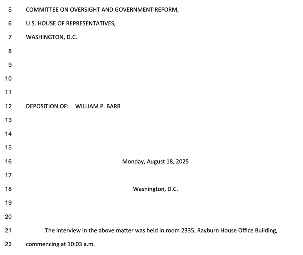 I wrote about this when I first got my hands on it, but many of you have since joined me and so because it is so… interesting.. I thought I’d mention it again. In August the House Oversight committee took the deposition of William ‘Bill’ Barr, the former Attorney General, regarding Epstein, Trump, Bill and Hillary Clinton, and others. Barr was appointed as Attorney General under George H.W. Bush, and then also by Trump in Trump I, where he lasted a bit over a year and a half. (Notes from the Front members: the pdf of the full 129-page deposition is included for you.)