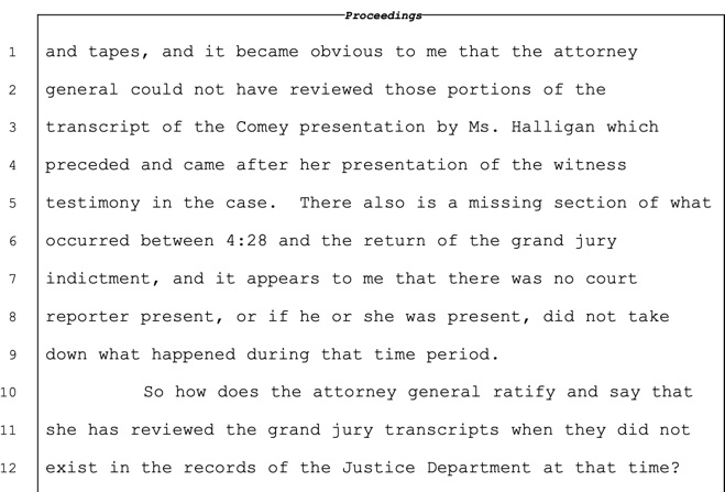 “THE COURT: Let me ask you this. I was involved in receiving in camera provisions of the grand jury transcripts and tapes, and it became obvious to me that the attorney general could not have reviewed those portions of the transcript of the Comey presentation by Ms. Halligan which preceded and came after her presentation of the witness testimony in the case. There also is a missing section of what occurred between 4:28 and the return of the grand jury indictment, and it appears to me that there was no court reporter present, or if he or she was present, did not take down what happened during that time period. So how does the attorney general ratify and say that she has reviewed the grand jury transcripts when they did not exist in the records of the Justice Department at that time?