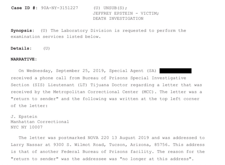 “On Wednesday, September 25, 2019, Special Agent (SA) received a phone call from Bureau of Prisons Special Investigative Section (SIS) Lieutenant (LT) Tijuana Doctor regarding a letter that was received by the Metropolitan Correctional Center (MCC). The letter was a “return to sender” and the following was written at the top left corner of the letter: