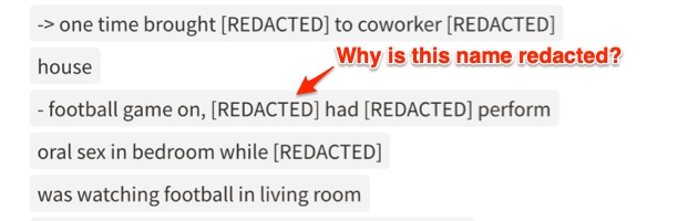 And when I read the transcribed version a few things jumped out at me. Like why the flock they redacted the name of the person *receiving* (or perhaps orchestrating) a blow job from the victim.