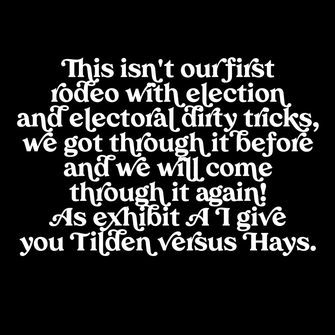 I know that these are stressful times, what with Trump trying to game the elections, so I am here to tell you that no matter what he tries, we will get through this. And it is not, by far, the first time that this has happened. We got through it before, and we will get through it again. So let me share a story with you. It’s the story of Tilden versus Hays, two candidates for president in 1876.  This is from The Miller Center, and this is the first part of it (with link to the full story at the end):