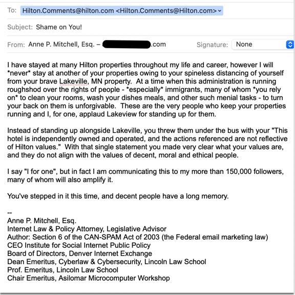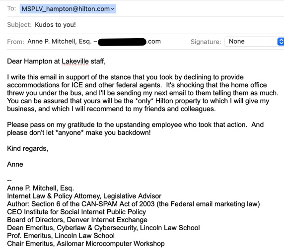 MY LETTERS BOTH TO THE LAKEVILLE HAMPTON INN by HILTON THAT STOOD UP TO ICE, AND TO HILTON CORPORATE FOR THEIR SPINELESS DISTANCING THEMSELVES FROM THAT LOCATION