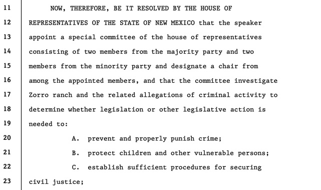 Just a few hours ago the New Mexico House of Representatives passed a *unanimous* *bipartisan* measure to open investigations into Epstein’s Zorro ranch. The legislation, HR 1 (included for Notes from the Front members) empowers a committee of four representatives (two Democrats and two Republicans) to “investigate Zorro ranch and the related allegations of criminal activity to determine whether legislation or other legislative action is needed to: