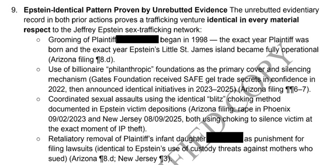 In a stunning 149-page complaint filed last week (included for Notes from the Front members) an anonymous (redacted) plaintiff accuses Donald Trump of all sorts of heinous acts. The Complaint also implicates Bill Gates, Elon Musk, and others, and alleges that Trump, Musk, et al have engaged in “Epstein identical” actions, methods, and retaliatory tactics. (And a huge h/t to colleague Jordan Parker)
