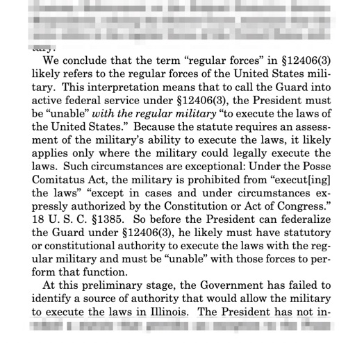You may also recall that much of the government’s argument was founded in their assertion that the federalization and deployment of the National Guard was allowed under 10 U. S. C. §12406(3) of the Federal law. This law allows the president to federalize and deploy National Guard troops if (and *only* if) he is unable to “execute the laws of the United States” with, and this is important, “regular forces”.