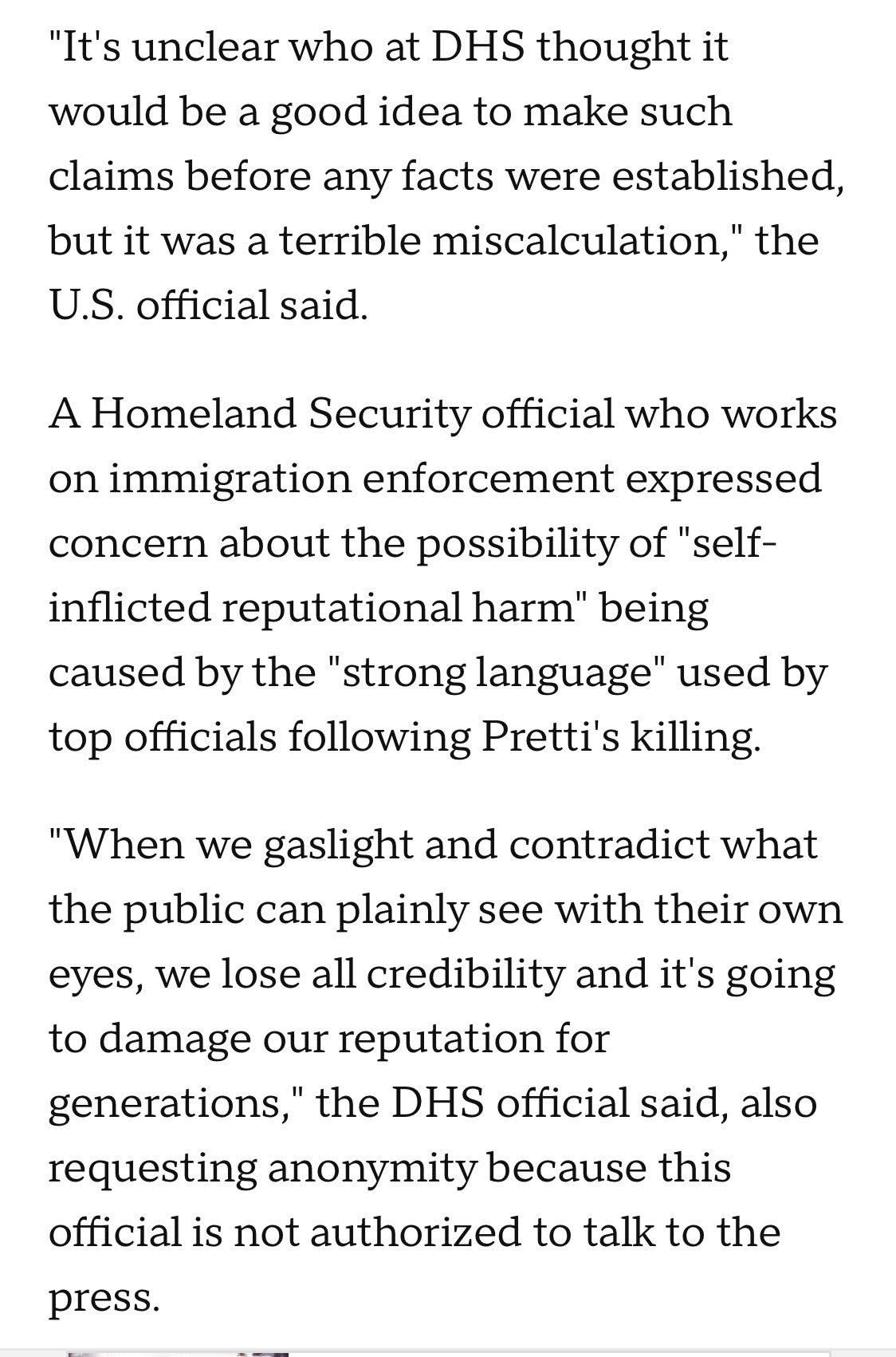 A Homeland Security official who works on immigration enforcement expressed concern about the possibility of “self-inflicted reputational harm” being caused by the “strong language” used by top officials following Pretti’s killing.