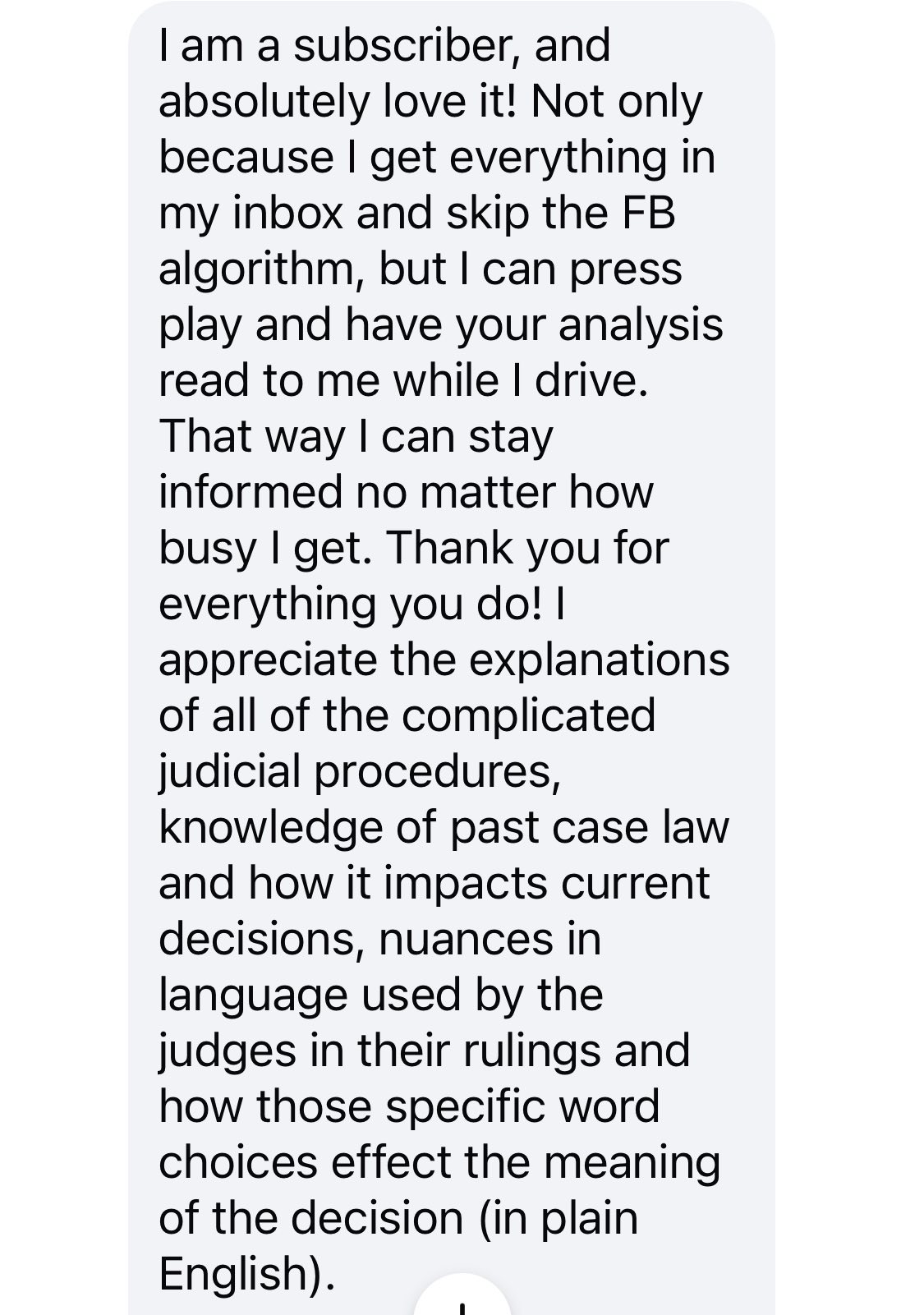 This is a part of a conversation that I am posting with permission, to point something out: you don’t have to do either of these things to make sure that you don’t miss any of my court and legal action updates. Instead of searching for me on Facebook, or waiting for the algorithm to show you if I have posted something, you can sign up for free at Substack and you will receive all of my legal and court updates right in your inbox. Those are the only things I post on Substack so you won’t be getting any of the silly stuff or the personal stuff, just the legal and court updates right in your inbox for free.  So if you don’t want to miss any of those, here’s where to sign up, again for free, to get them emailed to you right into your inbox: