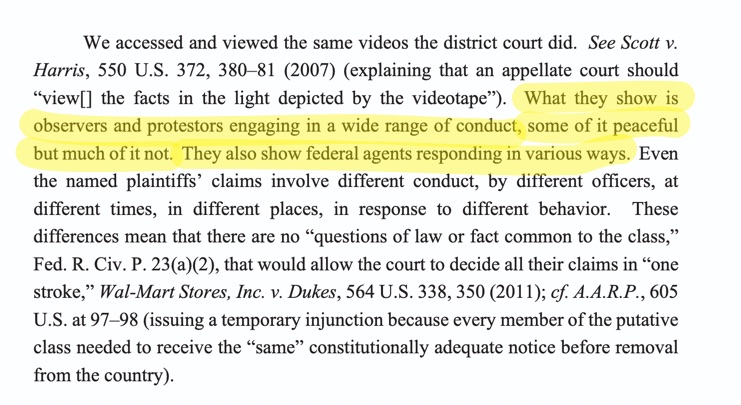 “We accessed and viewed the same videos the district court did. What they show is observers and protestors engaging in a wide range of conduct, some of it peaceful but much of it not. They also show federal agents responding in various ways. Even the named plaintiffs claims involve different conduct, by different officers, at different times, in different places, in response to different behavior. These differences mean that there are no questions of law or fact common to the class that would allow the court to decide all their claims in one stroke.”