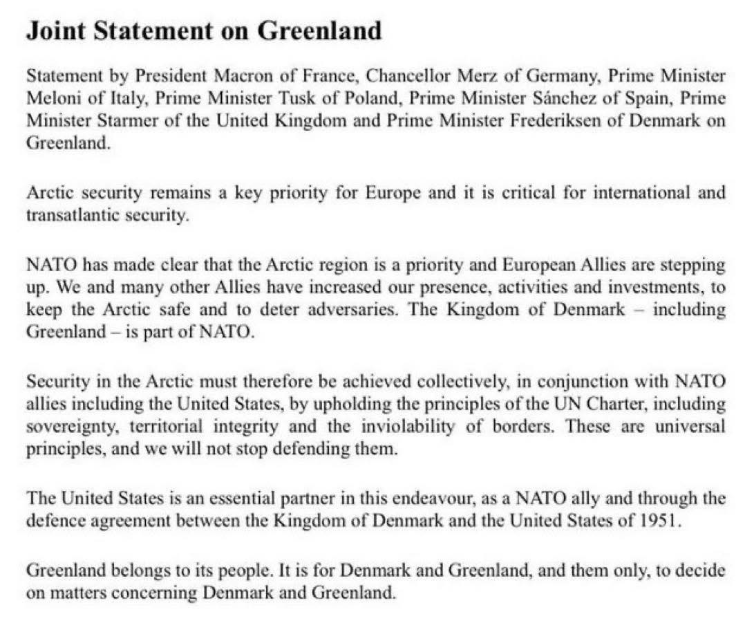 Trump has not ruled out using force to take Greenland, though he says he plans to pursue an offer to buy it instead. In response, France, Germany, Italy, Poland, Spain, the United Kingdom, and the Kingdom of Denmark issued a joint statement reaffirming Greenland’s status and sovereignty.