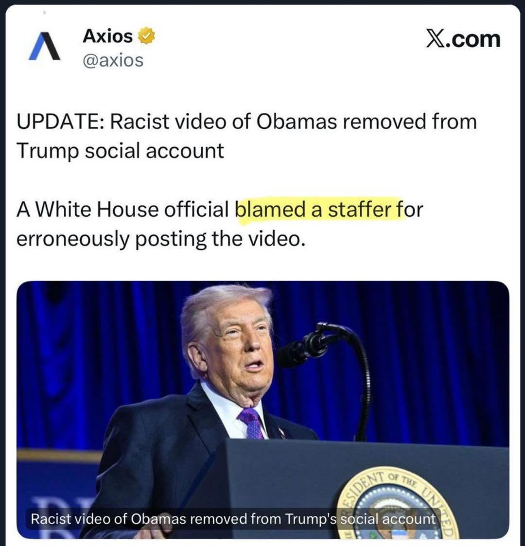 Trump now says he didn’t personally post the racist video and that it was done by a staffer. That raises serious questions. If a staffer handled this post, it’s fair to ask which other public statements or posts are actually coming directly from him versus someone on his team. This is deeply troubling and leaves everyone wondering who is actually running our country?