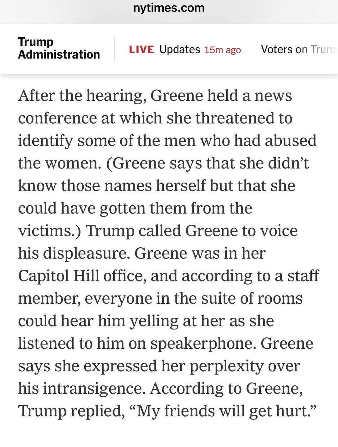 ”After the hearing, Greene held a news conference at which she threatened to identify some of the men who had abused the women. (Greene says that she didn’t know those names herself but that she could have gotten them from the victims.) Trump called Greene to voice his displeasure. Greene was in her Capitol Hill office, and according to a staff member, everyone in the suite of rooms could hear him yelling at her as she listened to him on speakerphone. Greene says she expressed her perplexity over his intransigence. According to Greene, Trump replied, “My friends will get hurt.” ”