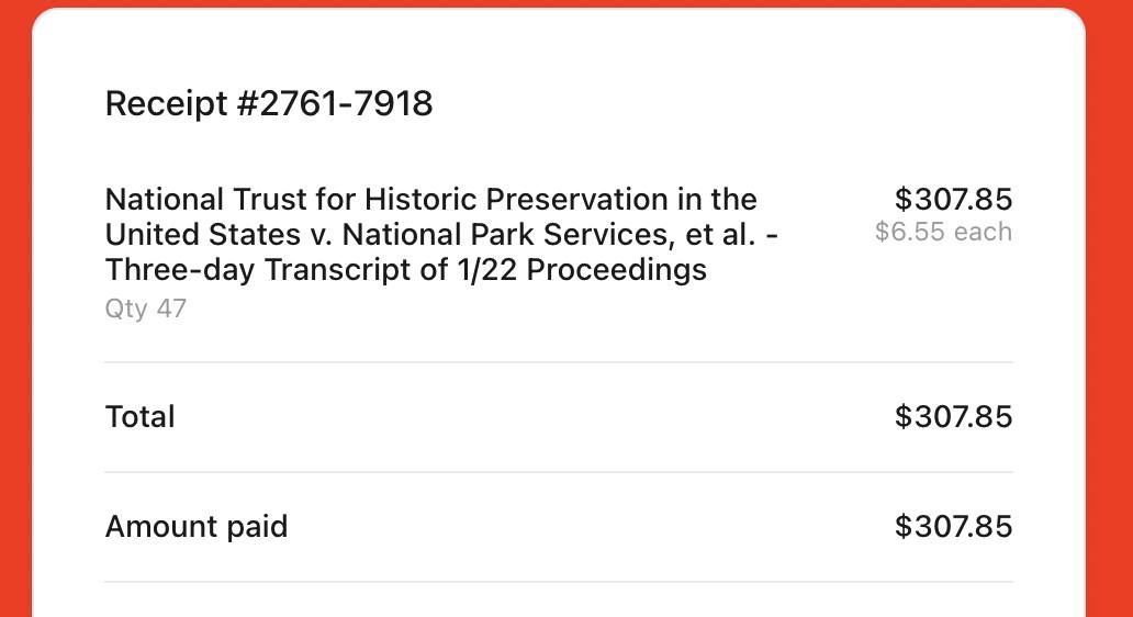 I have just ordered the full transcript of yesterday’s hearing regarding Trump’s ballroom project. It’s supposed to be delivered to me on Monday, and I’ll be writing it up then (and making the transcript itself available to Notes from the Front members). I expect it to be both awesome and entertaining, given the snippets of the Court’s questions that I’ve heard so far. The screenshot is of the receipt for the transcript so Notes from the Front members can know that your membership dues go to good use (and to educate people who believe that these documents are free, and – honestly – to help shut up the people who batch at me for having the nerve to charge $5 a month).
