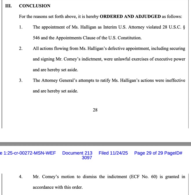 In a glorious, 29-page opinion (included for Notes from the Front members) Judge Cameron Currie just dismissed the lawsuit against James Comey, and excoriated the administration, calling Halligan’s appointment as an interim U.S. Attorney unconstitutional and “defective”. In fact the *very first sentence* of the opinion and order calls out her zero lack of experience as a prosecutor, saying “On September 25, 2025, Lindsey Halligan, a former White House aide with no prior prosecutorial experience, appeared before a federal grand jury in the Eastern District of Virginia.”