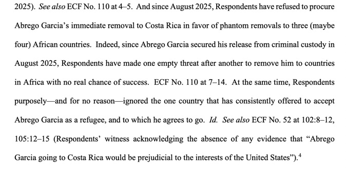 She then goes through the background and the legal posture of the case, including addressing the administration’s claims that “because the order of removal did not become “administratively final” until last month, Abrego Garcia is still within the statutory “removal period,” and his immediate re-detention and the resetting of the Zadvydas period are required.”