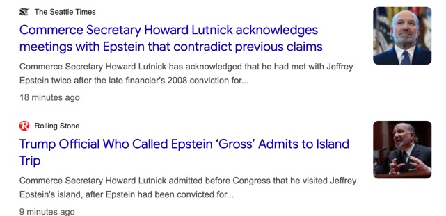 Today, before the Senate appropriations committee, Lutnick admitted that, contrary to what he had said earlier, he had in fact *not* cut ties with Epstein in 2005. In fact, he and his family went to Epstein’s island *after* Epstein’s 2008 conviction. In other words, Lutnick *knew* that Epstein was a *convicted* child abuser while *planning and taking a trip to Epstein’s island!