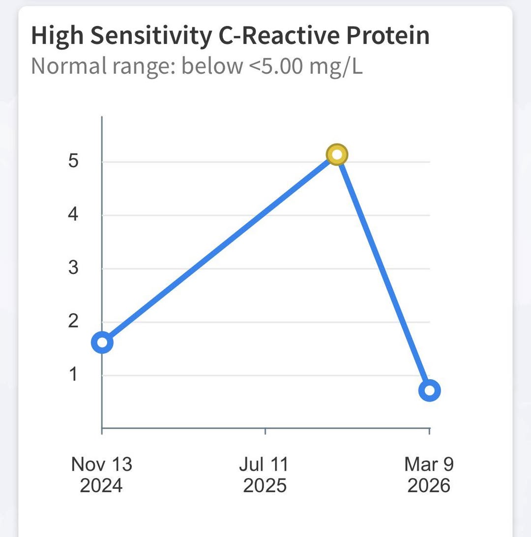 Background: During routine labwork this past July my HSCRP (high sensitivity c-reactive protein) was very, unusually high. This can indicate something causing high inflammation in the body (an infection, autoimmune stuff spiking, cancer, etc.).  After freaking out a bit I remembered that just a few days before I had gotten my Covid booster, asked the doctor if that could have done it, the doctor said absolutely, and that we should retest. It took a while for me to retest because in the interim I also got the flu shot. But I just tested this morning, opened the results, and that broad, irrepressible smile hit my face!